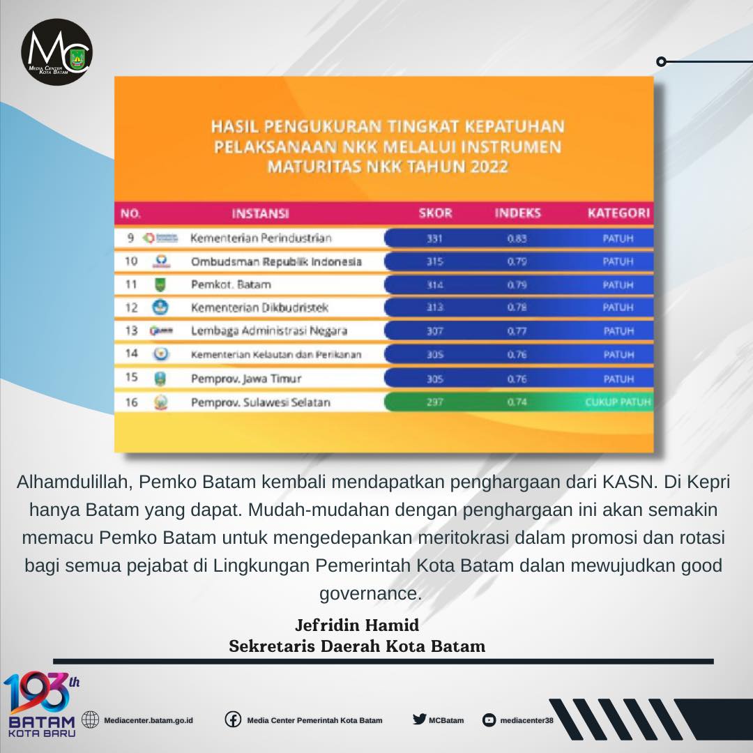 Adapun penghargaan yang diberikan kepada Pemko Batam yakni Indeks Maturitas Nilai Dasar, Kode Etik, dan Kode Perilaku ASN (IM-NKK). Dimana Kota Batam mendapatkan skor 314 dengan indeks 0,79 masuk kategori patuh.