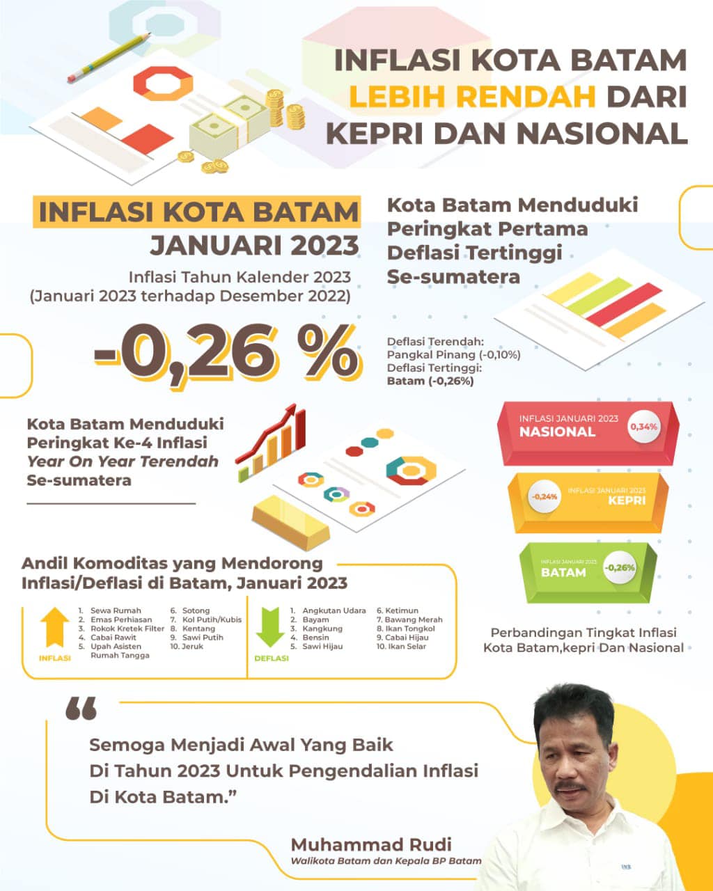“Inflasi Kota Batam Januari 2023 tercatat -0,26 persen, dimana lebih rendah dari Inflasi Kepri yaitu -0,24 persen dan Nasional 0,34 persen”, kata Aguskadaryanto.
