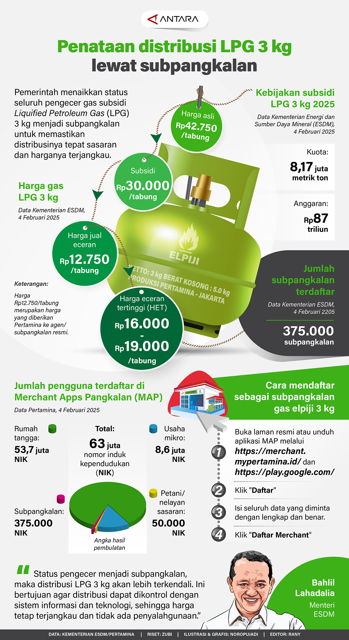 Beranda MENYAPA NUSANTARA INFO GRAFIS Penataan Distribusi LPG 3 Kg Lewat Sub Pangkalan Headline, INFO GRAFIS, MENYAPA NUSANTARA Penataan Distribusi LPG 3 Kg Lewat Sub PangkalanNoviantoKamis, 06/02/2025 - 13:26 WIBKamis, 06/02/2025 - 13:29 WIB BATAMCLICK.COM: Pemerintah menaikkan status seluruh pengecer gas subsidi Liquified Petroleum Gas (LPG) 3 kg menjadi sub pangkalan untuk memastikan distribusinya tepat sasaran dan harganya terjangkau. Sumber: Antara Baca JugaKKP tangkap tiga kapal asing dan selamatkan potensi rugi Rp20,2 miliarMenkum: Sinergi pemerintah dengan notaris perkuat kepastian hukumPemkot Batam percepat implementasi QRIS guna perkuat digitalisasiRutan Batam gelar pemeriksaan kesehatan gratis bagi pengunjungJNJ Specialist Dental Centre Raih Status Invisalign Diamond Elite ProviderBupati Cen Sui Lan Luncurkan Bantuan Pangan Tahap II, Targetkan Pembangunan Gudang Bulog di Wilayah Kepulauan