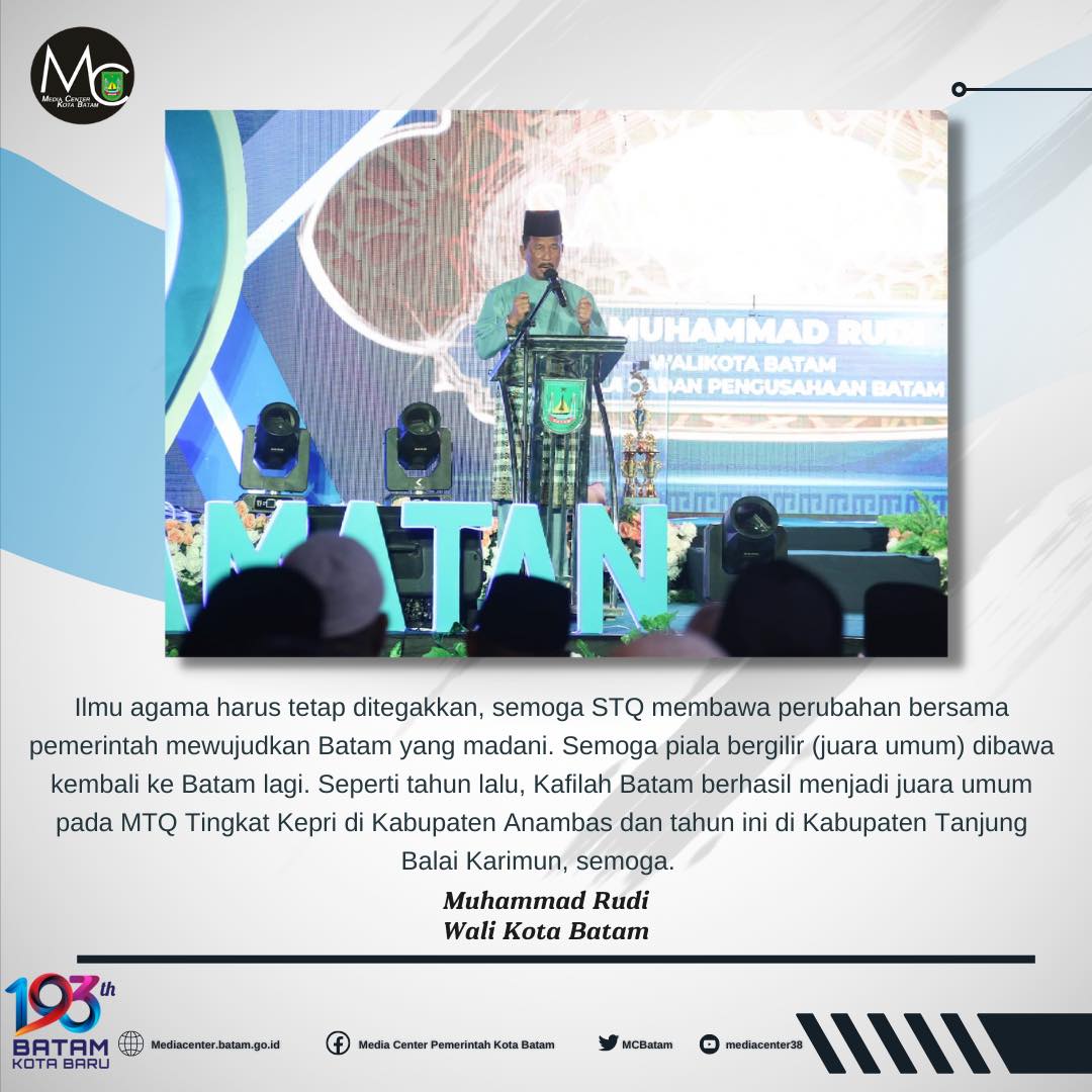 Tahun 2022 lalu, Kafilah Batam berhasil menjadi juara umum pada MTQ Tingkat Kepri di Kabupaten Anambas. Rudi berharap capaian yang sama juga akan dicapai pada MTQ tahun 2023 di Kabupaten Tanjung Balai Karimun.