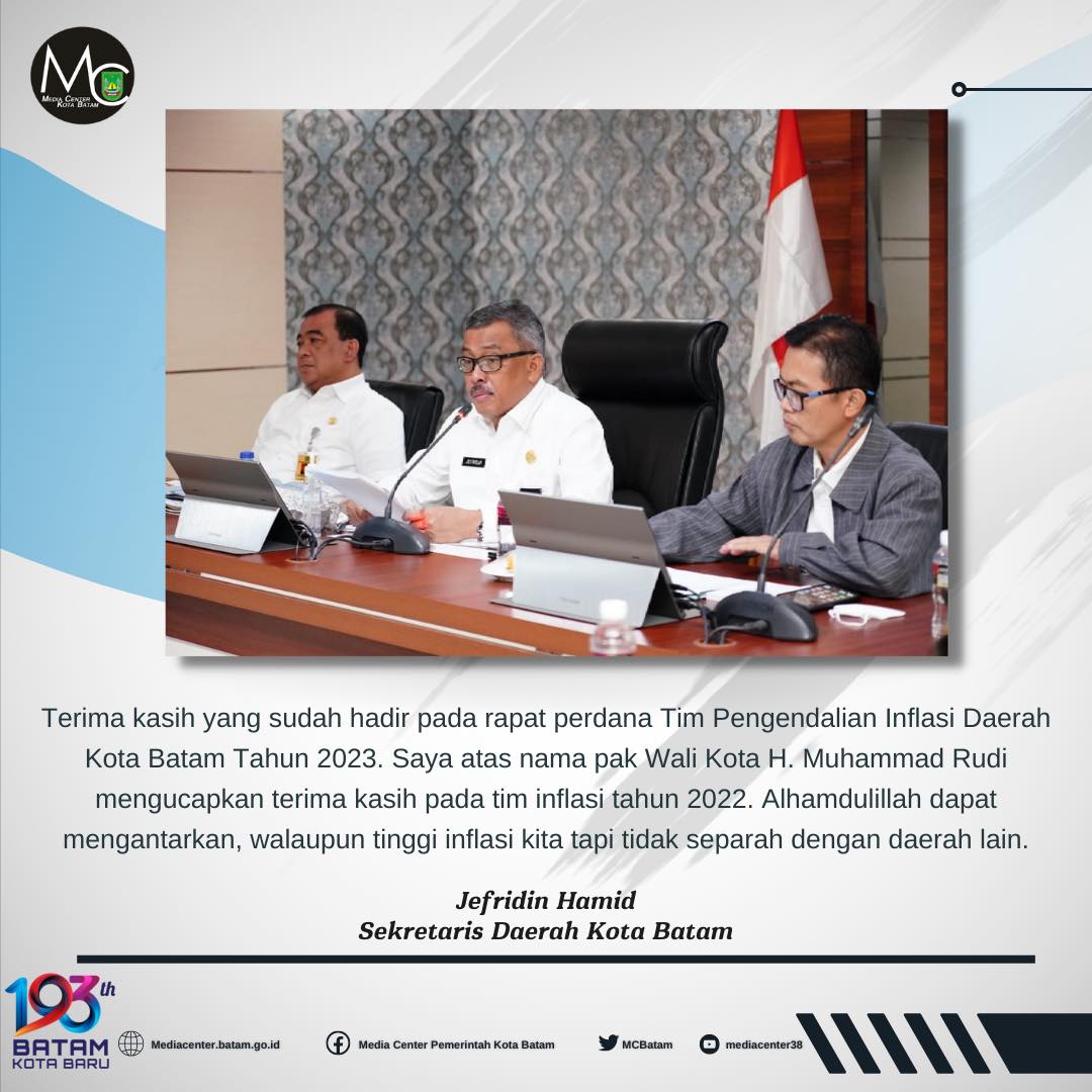 “Terima kasih yang sudah hadir pada rapat perdana Tim Pengendalian Inflasi Daerah Kota Batam Tahun 2023. Saya atas nama pak Wali Kota H. Muhammad Rudi mengucapkan terimakasih pada tim inflasi tahun 2022. Alhamdulillah dapat mengantarkan, walaupun tinggi inflasi kita tapi tidak separah dengan daerah lain,” ujar Jefridin.