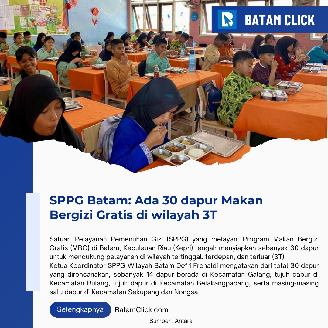 Beranda MENYAPA NUSANTARA INFO GRAFIS Batam Bangun 30 Dapur MBG di Wilayah 3 T INFO GRAFIS Batam Bangun 30 Dapur MBG di Wilayah 3 TNoviantoMinggu, 14/12/2025 - 20:57 WIB Baca JugaDPRD BATAM PERKUAT SILATURAHMIRSBP Batam Hadirkan Layanan Penanganan Sakit Jantung BawaanBulog Bangun Gudang Logistik di 4 Kabupaten KepriBP Batam Serahkan BMN ke TNI AUGEMA Batam untuk Batam Lebih AsriPerintah Presiden, Polisi di Karimun Bersih-Bersih