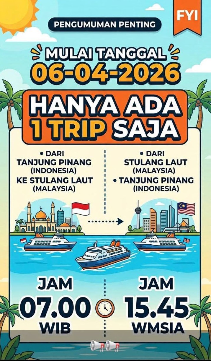 BATAMCLICK.COM: Update Jadwal Feri Rute Tanjung Pinang – Stulang terhitung mulai 6 April 2026, layanan kapal feri yang menghubungkan Tanjung Pinang (Indonesia) dan Stulang Laut (Malaysia) mengalami penyesuaian jadwal. Kini, hanya tersedia satu kali perjalanan (1 trip) pulang-pergi setiap harinya.