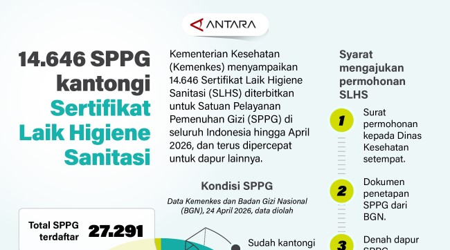BATAMCLICK.COM: Kementerian Kesehatan (Kemenkes) menyampaikan 14.646 Sertifikat Laik Higiene Sanitasi (SLHS) diterbitkan untuk Satuan Pelayanan Pemenuhan Gizi (SPPG) di seluruh Indonesia hingga April 2026, dan terus dipercepat untuk dapur lainnya.